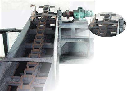 (一)結(jié)構(gòu):南主動鏈輪、從動鏈輪、鏈條、減速器、電機(jī)、鋼板槽、托輥、壓輥、支架等組成。鋼槽或水泥渣溝底用耐磨材料鑲制,槽內(nèi)用水封。漏灰斗口必須插人槽內(nèi)水面以下,達(dá)到水封目的。